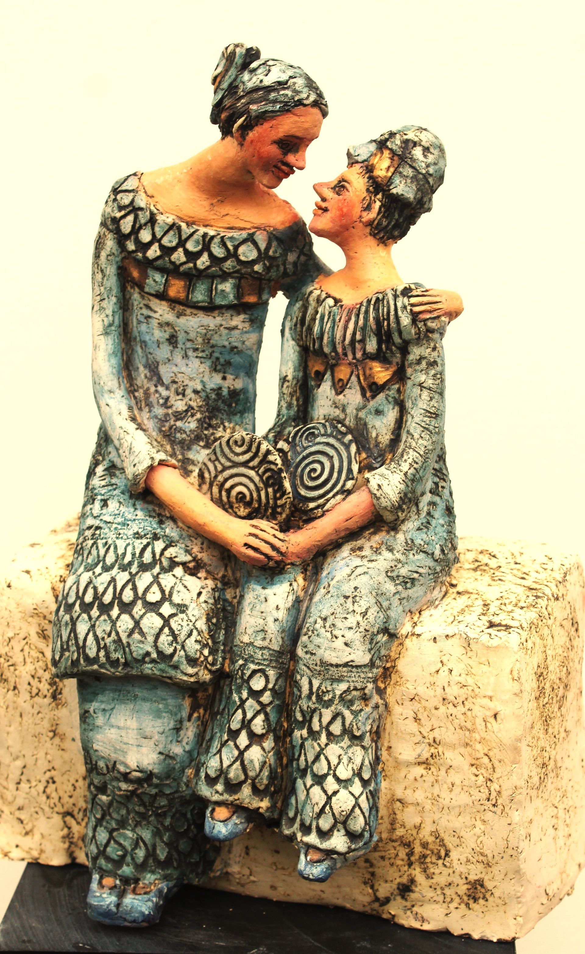 Besonders berührt haben mich die keramischen Arbeiten: verbundene Paare und weibliche Figuren, die Nähe, Schutz und Beziehung spürbar machen. Eine dieser Arbeiten wird in der Ausstellung zu „Blind Date“ gezeigt. Sie trägt den Titel „Annäherung an Verlorengegangenes“.