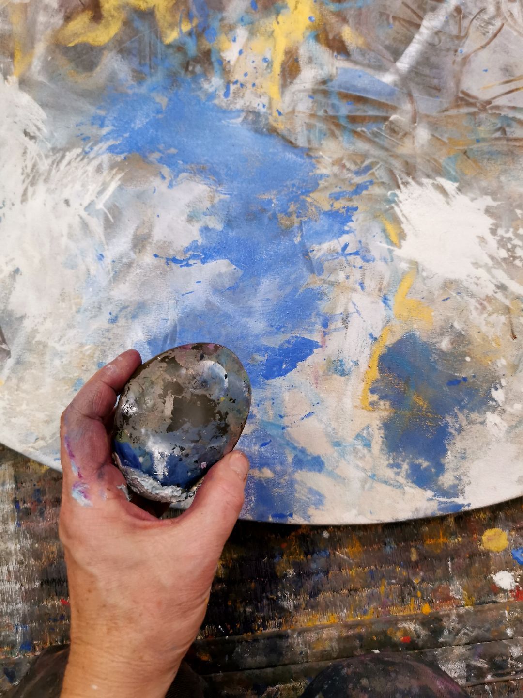 Deine Finger, sie wischten. Deine Finger, sie tunkten. Deine Finger drehten den Kreis und damit die Farben. Wo ist Norden, habe ich mich gefragt. Ich habe geschaut, wieder und wieder mich gefragt: