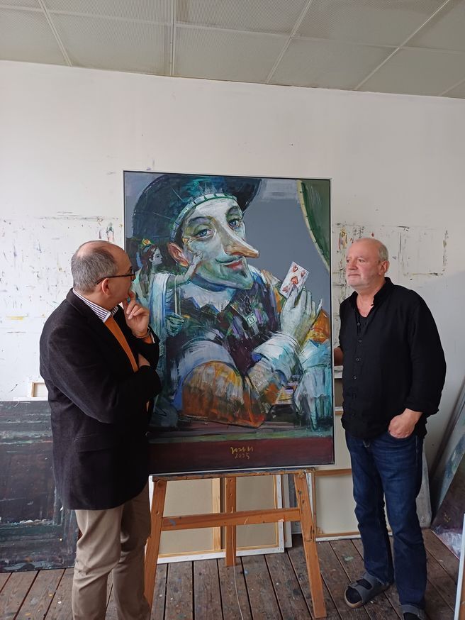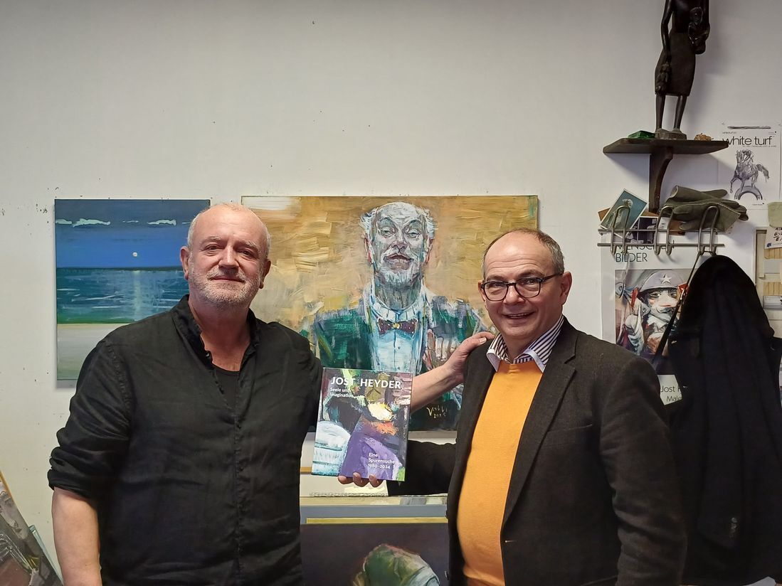 Beim Eintritt ins Atelier von Jost Heyder verschafft die Fülle künstlerischen Schöpfens eine unbändige Lust, um einzutauchen. Egal, ob mit den Augen oder beim Blättern mit den Fingern, man hat das Gefühl einer nicht enden wollenden Entdeckungsreise. Eine Skizze vom Erfurter Dom, daneben eine italienische Landschaft, die lehrende Schwiegermutter aus Gotha gerahmt auf dem Erdboden stehend, und gleich gegenüber hebt Kurt Masur den Finger zum Dirigat. Doch mittendrin thront der Herzbube.Die Marionette ist Teil des Lebens von Jost Heyder und begegnet seinem Betrachter immer wieder, seit der Künstler in den 1980er Jahren die Faszination dieser Puppen für sein Schaffen entdeckte. An Seilen sicher hängend, unsichtbar kraftvoll sich bewegend, in Gelenken spielend auftrumpfend und dabei durchdringlich schauend – so sind seine Gemälde. Der Herzbube mit dem überdimensionalen Gesichtsausdruck, der scharfen spitzen Nase, den unterschiedlich blau schimmernden Augen und dem vorwärtsstrebenden Kinn, hält die Herzkarte in seiner Rechten dem Mädchen entgegen, das seine Wange neckend, neugierig auf das Skatblatt blickt.