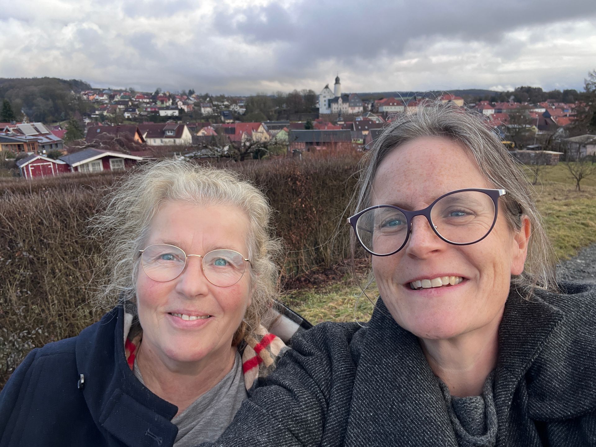 Bei einem Kaffee und der Rückfahrt nach Suhl, von wo aus die Heimreise von Luise Nerlich per Bahn erfolgte, gab es reichlich Gesprächsstoff und ein gemeinsames Foto vor dem Panorama von Eisfeld mit Schloss.