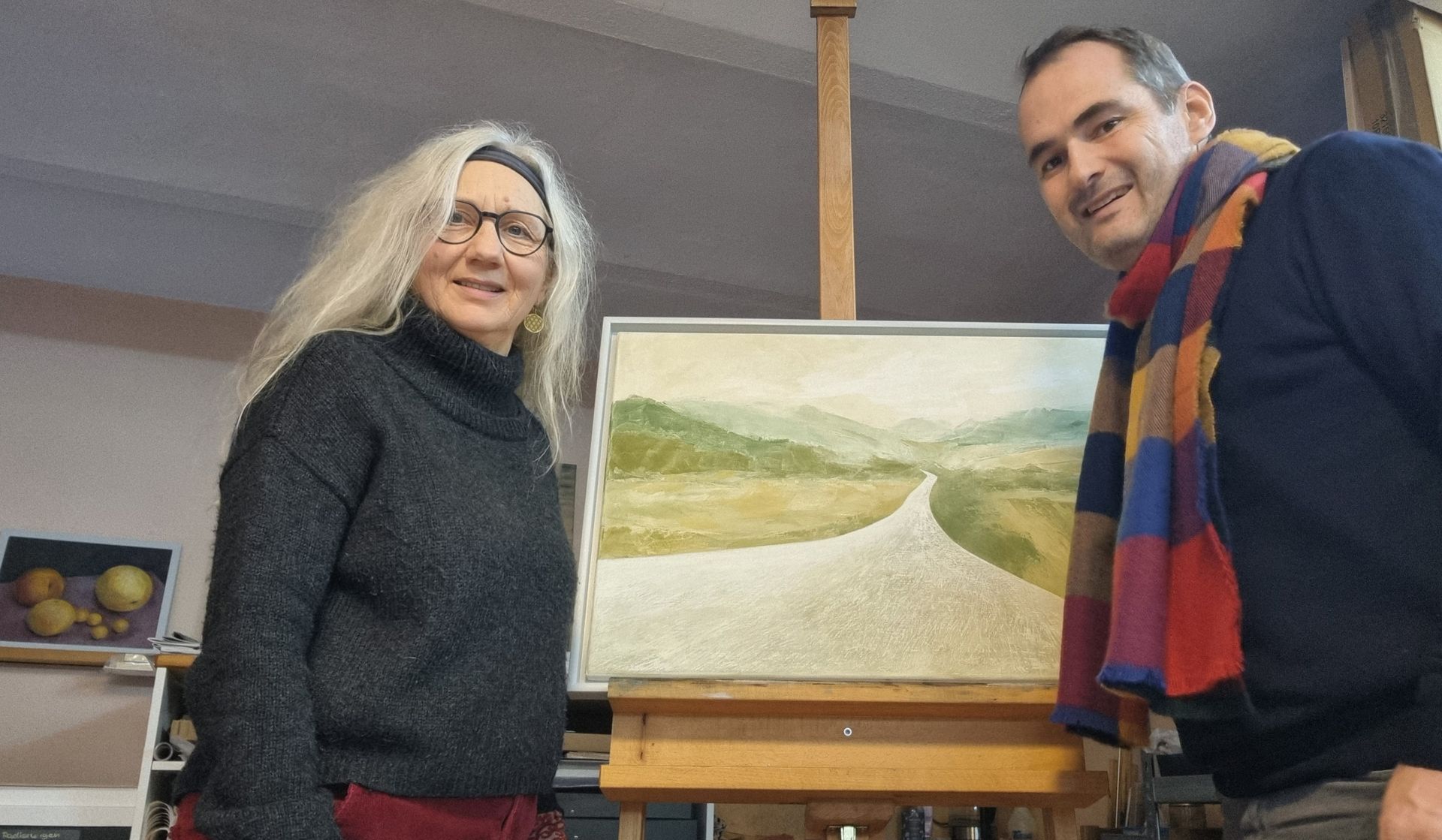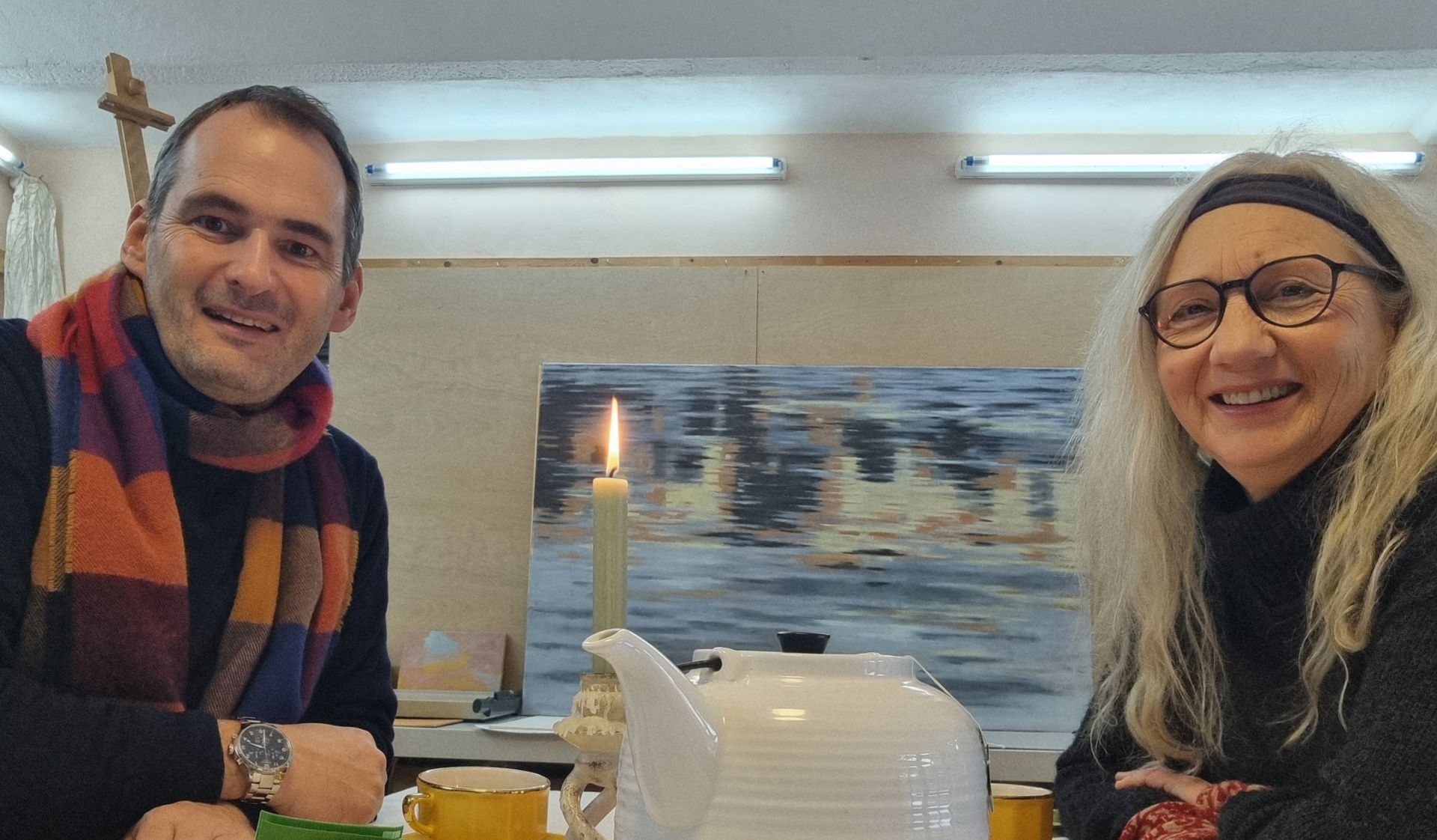 Über Geschichten zur Entstehung des Bildes und anderer Kunstwerke, über Techniken mit Ei-Öl-Tempera, über die verwendeten Farben, die Entstehung und die Umsetzung entspann sich ein wertvoller Austausch bei Tee, Keksen und Kerzenschein im Atelier in Heilbad Heiligenstadt. Auch über die Präsentation ihrer Werke im KUNSTRAUM in Heiligenstadt, in der WAW-Galerie in Weimar, in Ausstellungen und auf Kunst-Messen kamen wir ins Gespräch sowie über die Relevanz von Kunst und Kultur für den Tourismus. Dies könnte der Anfang einer wundervollen Freundschaft sein…