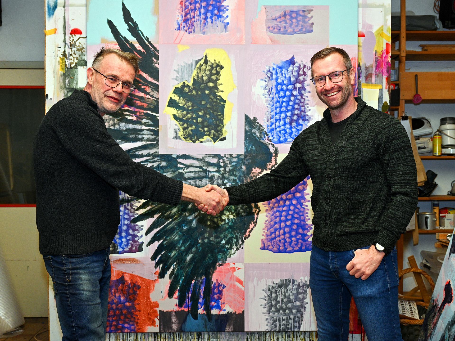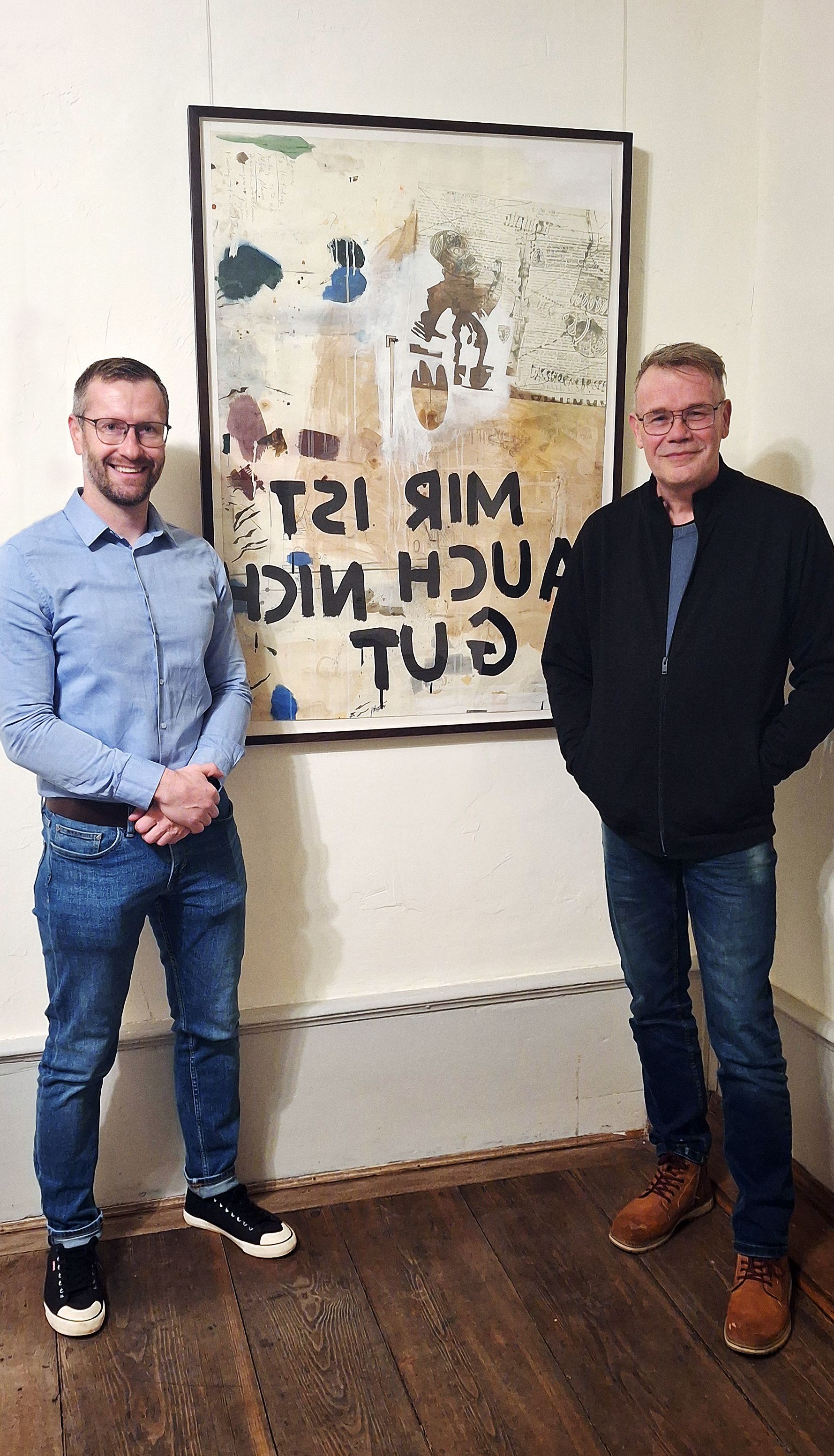 Am Freitag, den 23. Januar 2026 trafen sich in der Galerie am Weimarer Markt der Künstler Thomas Offhaus und der Polizist Björn Pauli erstmals. Zwischen Leinwänden und Farben sprachen wir zunächst über die Ausstellung von Thomas. Insbesondere bei Thomas‘ Werk „Mir ist auch nich gut“ blieben wir lange stehen und unterhielten uns über die Assoziationen, die dieses Bild bei mir auslöste. Ein Bild, bestehend aus Fragmenten, Überlagerungen, Spuren von Eingriffen. Nichts ist glatt, nichts abgeschlossen. Und mittendrin der Satz in Spiegelschrift - scheinbar schlicht, fast trotzig: „Mir ist auch nich gut.“