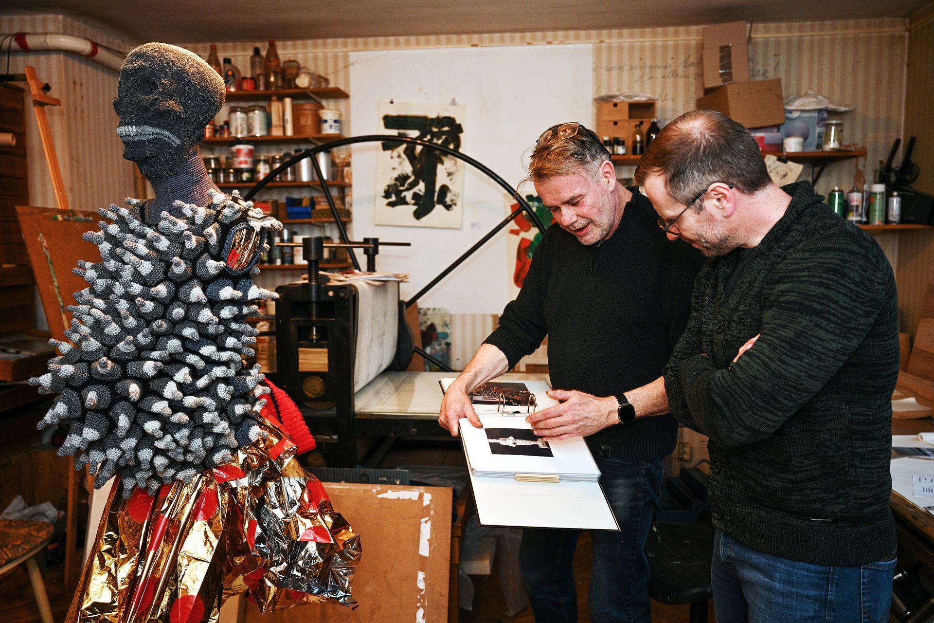 Im Atelier von Thomas trafen wir uns am 3. Februar 2026, um über sein Ausstellungswerk - ein Ensemble aus dem Gemälde „Request“ und der Skulptur „Vielbrüstige“ - zu sprechen. Ein Ensemble, dass die Artemis von Ephesos - Symbol für unerschöpfliche Fruchtbarkeit und Nahrung - zitiert und mit dem Fragment eines schwarzen Nike-Flügels - Symbol des Sieges, triumphaler Überlegenheit und Unterwerfung - kombiniert.