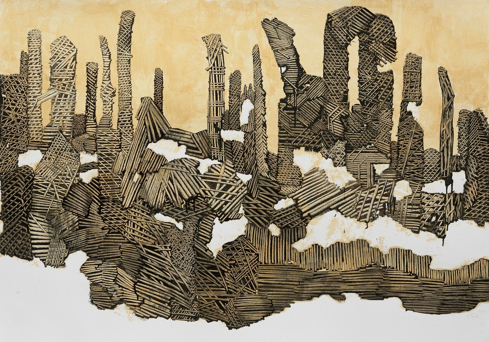 Was bleibt, morgen? In ihrem dreiteiligen Werk „Stadt“ erforscht sie die Themen Untergang und Neuanfang. Zwischen den Linien, die wie gestapelte Äste wirken, entstehen feine Risse zwischen den Fugen. Die gezeichneten Linien, mit Öl- und Acrylfarben aufgetragen, stellen fiktive Gebäude dar. Diese Risse ebnen der neuen Form den Weg und schaffen Raum für neue Erzählungen. Barbara Toch erzählt zeichnerisch, von der Schönheit der Zerstörung und der Kraft des Neubeginns.